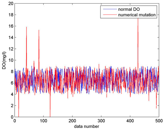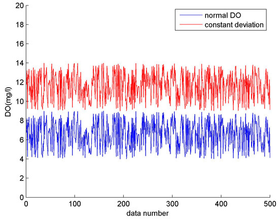 Figure 5. Constant deviation (DO). - Numerical mutation. The acquired value becomes overrun or is much less than normal. The fault can be expressed by the following equation:where denotes the mutation value and is a random function representing the time a numerical mutation occurs. In Figure 6, the fault sample represented by the red line is randomly generated, and there is no law at all.
