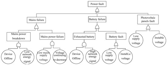 The fault tree of the IoT is divided into six sub-modules based on fault definitions: power fault tree, collector fault tree, sensor fault tree, software fault tree, environmental interference fault tree and communication modules fault tree. Figure 9 shows the power fault tree. Power faults are top events caused by mains failures, battery failures and photovoltaic panel failures which are connected by a logical “OR”: