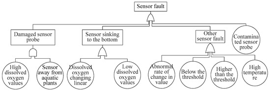 Figure 10 shows the sensor fault tree. Sensor faults are top events caused by damaged sensor probes, sensors sinking to the bottom of a pond, other sensor fault symptoms or the basic symptom contaminated sensor probe.