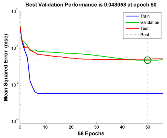 The FNN is established using the Matlab r2013b back propagation neural network toolbox. The input layer includes 22 nodes corresponding to the fault symptoms X1~X22. The output layer includes 13 nodes corresponding to the faults Y1~Y13. According the analysis of the 22 fault symptoms as the input layer nodes and the 13 output layer nodes for the Internet of Things (IoT) in aquaculture, we selected 10 nodes as hidden layer nodes. In the Discussion section, the results show the 10 hidden layer nodes can satisfy the fault diagnosis for the Internet of Things (IoT) in aquaculture. Training samples are obtained from practical maintenance experience. Figure 11 shows the training results of the FNN. The network converges quickly and achieves the best accuracy in epoch 50.