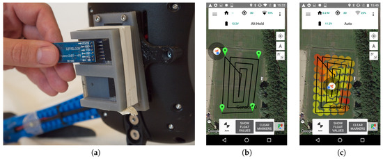 The readings picked up by the sensor module are relayed to a ground station using the featured telemetry modules; on the drone, the radio link module is connected directly to the flight computer (the Pixhawk/PX4). For this to work seamlessly with the drone setup, modifications have been made to the open-source flight computer firmware and ground station. Firstly, drivers and user space code on the Pixhawk computer interface with the sensor module and communicate with the ground station using custom messages defined as part of an existing open protocol format. Extensive modifications have gone into the code base of an open-source ground station application for Android. This allows the user to configure flight paths for surveying and retrieving the sensor data stream that, in turn, are seen in real time and are visualized on the map for every 10th reading—used later for offline analysis (see “Supplementary file” for example of collected data).
