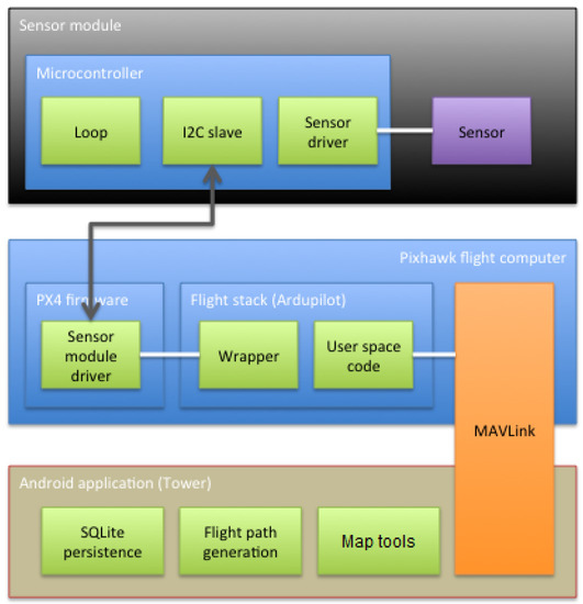 Our system is meant for attaching arbitrary low-cost sensors to an open-source robotics vehicle platform. Figure 3 provides a conceptual overview of the entire platform. The sensors are, in part, a piece of hardware that attaches to the drone. A simple protocol based on the common I2C peripheral protocol is used for interfacing with the flight computer. As long as the sensor modules conform to our hardware and software specifications, any low-weight sensor can be used.