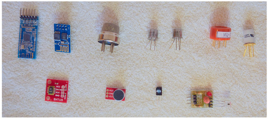 Examples of 11 low-cost sensors that can be integrated with the Arduino based micro controller. From top left are the following modules/sensors: HM-10 (Bluetooth), ESP8266 (WiFi), MQ-135 (air quality: NH3, NOx, alcohol, benzene, smoke and CO), Figaro TGS2600 (air quality: methane, CO, ethanol, hydrogen and iso-butane), Figaro TGS2602 (air quality: ammonia, hydrogen sulfide, toluene, ethanol and hydrogen), MQ-7 (air quality: CO), Figaro TGS2442 (air quality: CO), SparkFun 13683 (humidity and temperature), SparkFun 12758 (electric microphone), IR (infrared light) receiver and IR receiver module. The weight and cost of the sensors can be seen in Table 1.