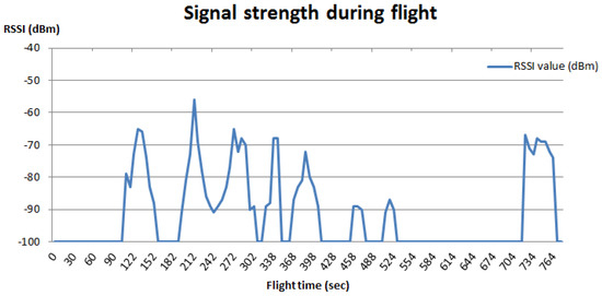 To illustrate how data collection may be used for educational purposes, a student assignment could be to conduct a test of the accuracy by which the Bluetooth sensor locates a beacon on the ground (cf. Figure 2). The students would then be asked to place two beacons somewhere on a field and collect data from e.g. a 2 m altitude. First, students should make a graph of signal strengths (i.e., RSSI-values) from their test flight (cf. Figure 7). The next assignment could then be to compare these results with recordings made when flying at, for example, 10 m, to conduct low-pass filtering of the raw data [33], and, finally, to depict the relation between true distance to the beacons and the RSSI-values.