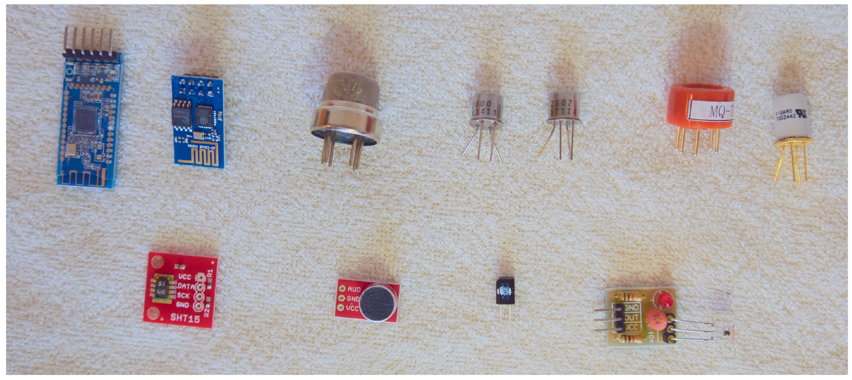 Figure 1: three parts are 3D printed to act as (i) base; (ii) container for micro controller and (iii) sensor mount. The sensor mount is for convenience to easily replace a sensor, while the base and container for the micro controller are the main parts of the system. By 3D-printing the mounts ourselves, we can comply with a broad range of sensors within a very short production time (see