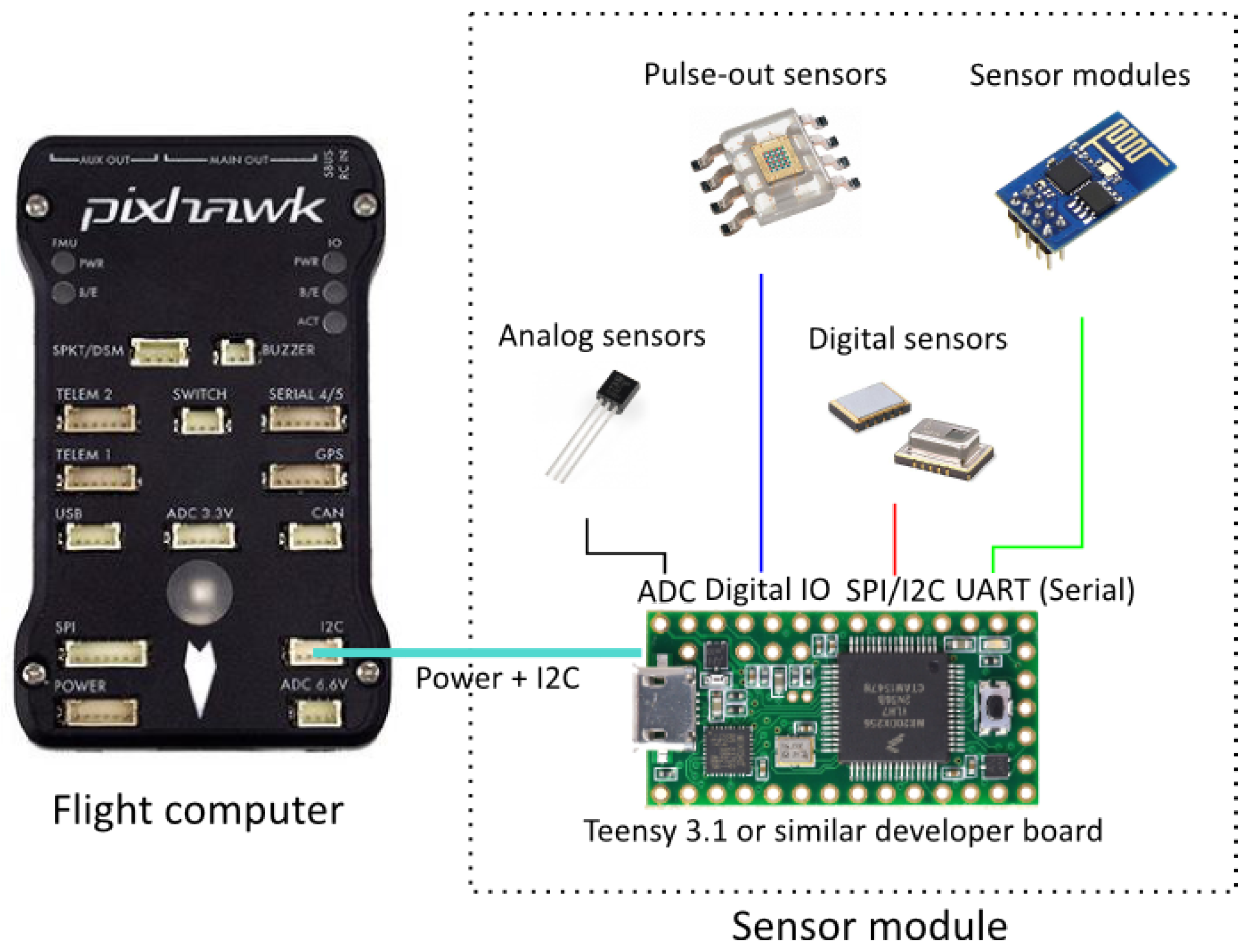 Figure 3 provides a conceptual overview of the entire platform. The sensors are, in part, a piece of hardware that attaches to the drone. A simple protocol based on the common I2C peripheral protocol is used for interfacing with the flight computer. As long as the sensor modules conform to our hardware and software specifications, any low-weight sensor can be used.