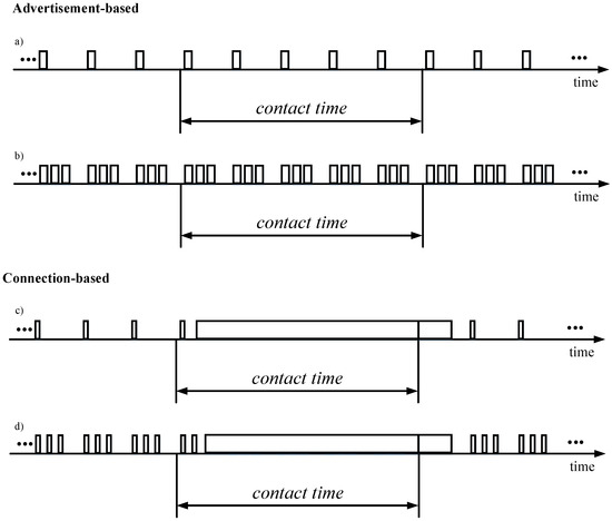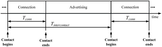 where Tconn and Iconn denote the duration and average current consumption of the connection-related phase, respectively, Iadv_conn is the average current consumption while the sensor node is advertising, and Tintercontact is the time between two consecutive contact events. Figure 7 shows an overview of the main variables and intervals involved in Equation (7).