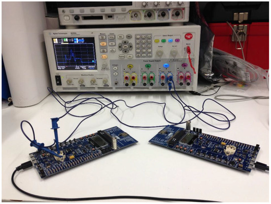 Experimental setup for current measurements of the BLE121LR modules using an Agilent N333 power analyzer. The module at the left works as a slave that connects to the module at the right, which operates as a master.