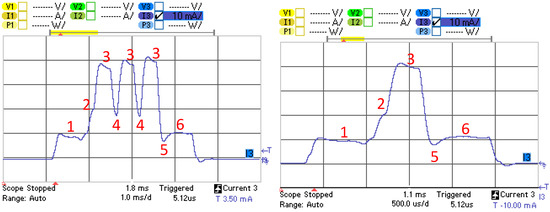 Current consumption profile of an advertising event for the BLE121LR platform, operating as a connectable advertiser. Single-advertisement (Left) and three-advertisement (Right) advertising events are shown.
