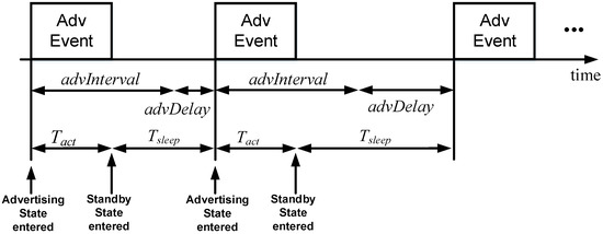 An advertiser transmits advertising packets through advertising channels within time periods called advertising events. The time between two consecutive advertising events is equal to advInterval + advDelay, whereby advInterval has a fixed value that may be configured between 20 ms and 10.24 s (for non-connection-oriented advertising packets, advInterval ranges between 100 ms and 10.24 s), and advDelay is a random variable uniformly distributed between 0 and 10 ms, intended to avoid possible harmful synchronization effects with other advertisers. In one advertising event, an advertiser transmits an advertising packet through one, two or the three advertising channels.