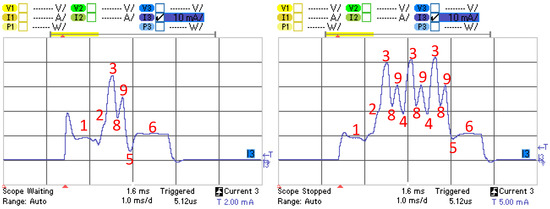 Because the behavior of the BLE sensor node in the advertisement-based approach is periodic, we model its current consumption during one such period. Each period comprises one advertising event, and otherwise the device is in sleep mode. Time and current consumption measurement results provided in this section are obtained from 10 measurements for a period. We found negligible differences within each set of 10 measurements, and results are well aligned with the ones also provided by the manufacturer [28].