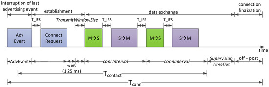 On the other hand, Tconn and Iconn comprise the following components: (i) interruption of the last advertising event before the connection; (ii) connection establishment; (iii) data exchange; and (iv) connection finalization after the end of the contact (see Figure 8). We next analyze these four components.