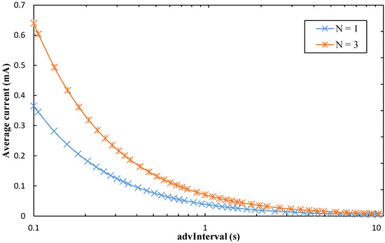 Let Tact and Iact be the duration and current consumption, respectively, of the active part (i.e., where the device is not in sleep mode) of the advertising interval (see Figure 5). Since the average duration of a period is equal to advInterval + E, Iavg_adv can be calculated as shown in Equation (1):