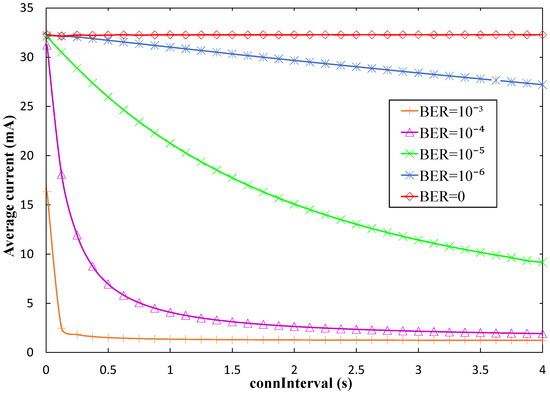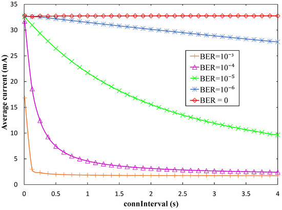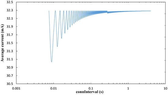 where denotes the expected number of round trip exchanges before connection event termination within connInterval, which can be obtained analytically by using Equation (2) of [30], assuming that bit errors are uncorrelated. Note that the previous equation provides an accurate, but not exact value for Iavg_CI since a further failed round trip exchange may take place in some situations, after the last successful one, leading to a current consumption increase, which will anyway be minor. Another observation is that the above equation is valid for most connInterval values, but for very low connInterval values (i.e., connInterval < 10 ms), there may not be enough time within connInterval for the node to traverse all the states mentioned after connection even termination. In that case, Equation (17) can be rewritten as follows: