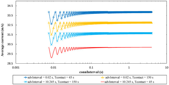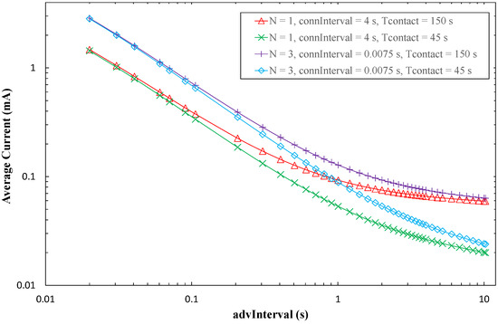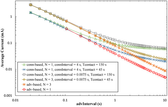 In order to ease a comparison between the advertisement- and connection-based approaches, Figure 16 plots the average current consumption of each method, as a function of advInterval, and for different Tcontact values. For the sake of clarity, only BER = 0 has been considered. Note that, for advertisement-based approaches, the minimum advInterval value is 100 ms.