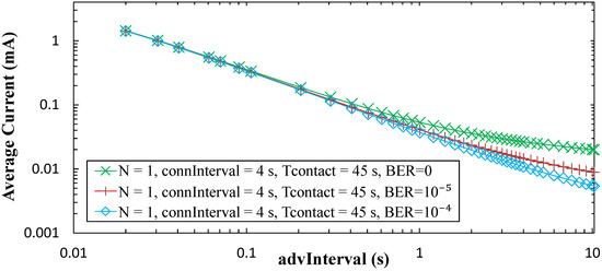 Average current consumption of the sensor node in the connection-based approach, for a time between contacts of one day, for N = 1, Tcontact = 45 s, and connInterval = 4 s, as a function of advInterval, and for different BER values.