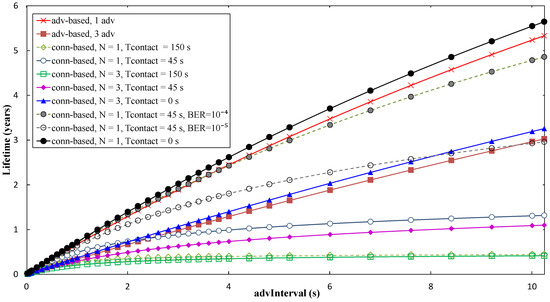 As shown in Figure 17, with the advertising-based approach, it is possible to achieve a theoretical sensor node lifetime up to 5.33 and 3.02 years, for N = 1 and N = 3, respectively. Using the connection-based approach, and assuming error-free communication, the sensor node lifetime can be of up to 1.31 and 1.09 years, for N = 1 and N = 3, respectively, and for Tcontact = 45 s.