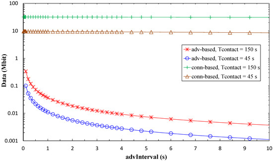 As shown in Figure 18, for low advInterval values, the amount of data that can be collected from the sensor node in the advertisement-based approach is 2–3 orders of magnitude lower than that of the connection-based approach. For high advInterval values, the difference increases to 4–5 orders of magnitude. In the connection-based mode, the amount of sensor node data that can be collected is almost independent of advInterval. With the considered assumptions, if the amount of data to be collected during the contact is below 334 kbit (i.e., ~42 kB), the advertisement-based approach suffices. However, for amounts of data greater than this value, the connection-based approach is the only feasible option, offering a capacity of 10 to 100 Mbit, depending on the contact duration. Considering Figure 17 and Figure 18, a trade-off can be observed between sensor node lifetime and amount of collected data that depends on the advInterval setting.