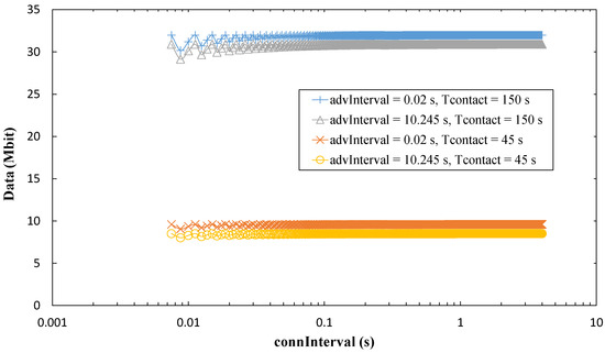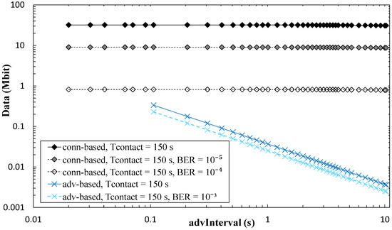 For the connection-based approach, influence of advInterval on the amount of collected data is low, and it decreases as Tcontact increases because a greater part of the contact time can be used for data exchange. Increasing connInterval slightly improves the amount of collected data. However, in Figure 18, only curves for connInterval = 4 s are shown, for the sake of figure clarity. Figure 19 presents results on the impact of non-zero BER on the amount of data collected. As expected, this performance parameter decreases with BER. However, such decrease with BER is greater for the connection-based approach than in the advertisement-based one. In the former, when errors lead to connection event termination, relatively long periods of inactivity (between connection event termination and start of the next connection event) will reduce significantly the amount of collected data. This effect is emphasized for high connInterval, where the duration of inactive periods will also be high. In the advertisement-based approach, amount of collected data is only significantly affected by channel errors for BER greater than 10−4. We have evaluated BER = 10−3, BER = 10−4, and BER = 10−5, in addition to BER = 0, but only the first one leads to visible differences when compared with BER = 0 in Figure 19.