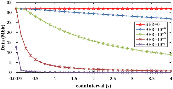 We next provide insight on the influence of connInterval on the theoretical maximum amount of data collected in the connection-based approach, for BER = 0 and for non-zero values of BER (see Figure 20 and Figure 21, respectively). As shown in Figure 20, for a Tcontact of 150 s and 45 s, the amount of collected data tends to grow asymptotically with connInterval, since a greater number of round trip exchanges are possible, and the unused part of connInterval becomes smaller in relative terms. Fluctuations of the amount of collected data, due to the fact that only an integer number of round trips are allowed per connInterval, are mostly significant for connInterval values below 100 ms. Figure 21 further illustrates the influence of BER on the amount of collected data as a function of connInterval. Amount of collected data decreases with connInterval and BER, most significantly for BER greater than 10−6.