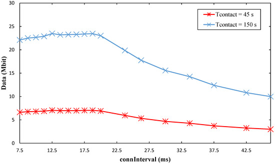 Maximum measured amount of collected data per contact interval, as a function of connInterval, for Tcontact values of 45 s and 150 s.