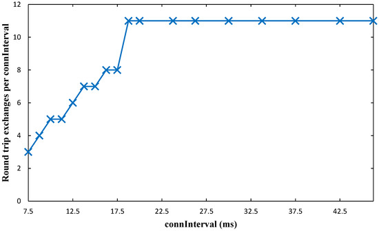 In order to provide insight on the above results, we also measured throughput within a contact interval. The maximum throughput within a contact interval achieved during the tests is 156.5 kbit/s. (It must be noted that, to our best knowledge, this obtained throughput value within a contact interval is the highest compared with the works available in the literature (see Section 2.2), and is higher than the one reported by the manufacturer. This was possible by using a timer-based application for generating and sending data, while the example code provided by the manufacturer involves more complex processing, including use of the Analog to Digital Converter (ADC), for the same purpose.) However, this value is limited by the maximum number of round trip exchanges per connInterval allowed by the platform, which we found to be 11 (see Figure 24).