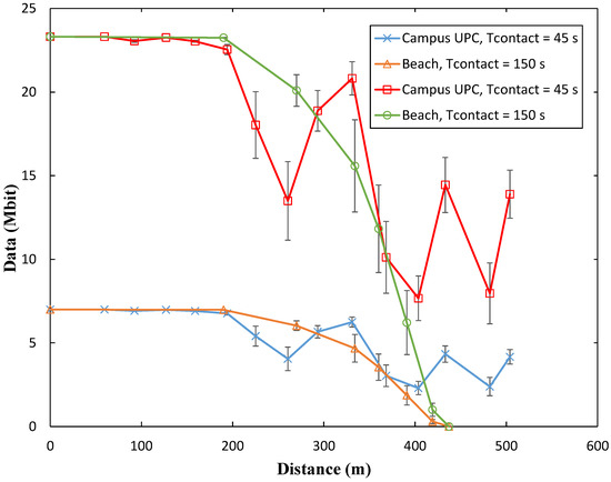 Measured amount of collected data as a function of distance between sender and receiver, in the university campus and beach scenarios.