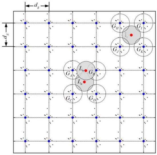 The detailed deployment rules and basic assumptions are described in the form as follows: (1) assuming that there are m predefined deployment points that are placed at the grid intersection points, denoted by ; (2) assuming that there are a total of M nodes in the network and these nodes are divided into m groups, denoted by , namely nodes in each group; and (3) the nodes within the same group are i.i.d., following a two-dimensional Gaussian joint distribution. For example, for the node k () in group (), the probability density function of node k’s coordination is represented as: