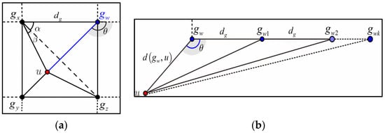 Consider that the deployment point that in the three o’clock direction of , as shown in Figure 4b, the distance between node and is . Given the distance , , and the angle , we can obtain the distance from node u to the nodes as: