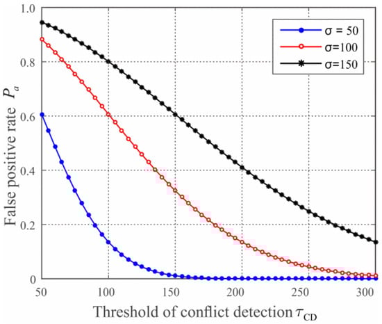 Using the same simulation scenario in Section 5.1, we consider three different cases in which , respectively. In each case, we vary from 50 to 300, the numeric results about the false positive rate of our scheme are shown in Figure 6. We observe that the false positive rate decreases significantly with the increase of the conflict detection threshold . This is reasonable since more suspected nodes pass the conflict detection when the value of conflict detection threshold is larger. We also observe that increases with the rise of when is fixed, which indicates that the security performance of our scheme enhances when the deployment accuracy improves. When , , the value of false positive rate is less than 1%, which means that the proposed scheme achieves a promising performance when the parameter are properly configured.