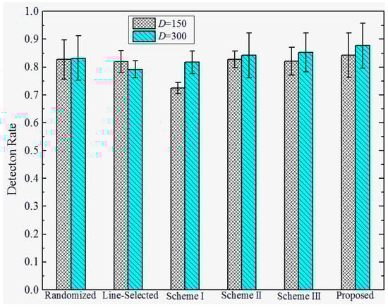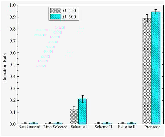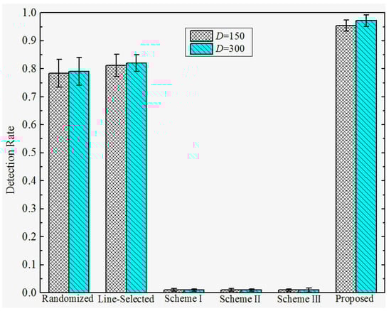 Detection rate of proposed versus prior works under attack strategy I when D = 200.