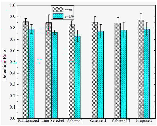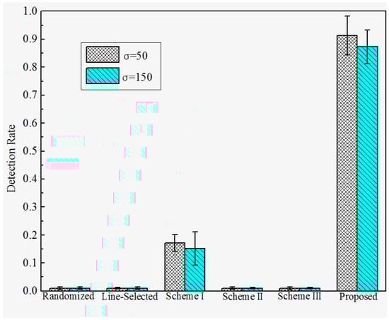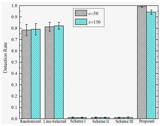 Detection rate of the proposed versus prior works under attack strategy I when .