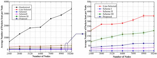 Comparison of Communication Overhead. We investigate the communication overhead of the proposed scheme with various number of total nodes in the network, and compare it with the previous schemes. We set and while varying M from 2560 to 10,240. The corresponding simulation results are shown in Figure 13. As illustrated in Figure 13, the simulation results on the communication overhead are closely match our theoretical analysis in Section 6.1. The communication overhead of our scheme only grows at with the number of nodes M in the network. The value of communication overhead of our proposal falls in between that of Scheme II and Scheme III. When the number of nodes ranges from 2560 to 10,240, our scheme requires each node to transmit up to an average of 76.3628 packets. This is because, in our scheme, the nodes are required to reply the LAQ in addition to sending location claims. However it is worthwhile to point out that compared with the aforementioned Scheme II and Scheme III, in our scheme fewer sensor nodes are involved in the location claim transmission, which results in a lower value of total communication overhead for the entire network.