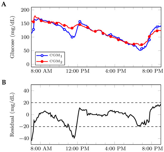 Illustration of continuous glucose monitor (CGM) sensor fault detection based on hardware redundancy. In this example, (A) a patient wears two CGM sensors at different locations, and (B) these signals are compared to generate a residual. A potential fault detection scheme based on hardware redundancy would analyze the residual for fault signatures; in this case, a simple threshold at ±20 mg/dL was used.