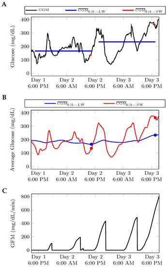 To eliminate false positives, an alarm is only issued if the number and slope of glucose readings in the short time window are above certain thresholds. An illustration of the calculation of the GFM is presented in Figure 2.