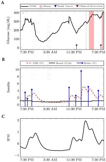 Illustration of the insulin fault metric () calculation for h and h. (A) The patient’s glucose level is given over time. Time points with retrospective alarms are shaded in red; (B) the basal and bolus insulin administration is passed to a second-order filter to determine the plasma insulin estimate (); (C) the calculated from the given insulin profile.