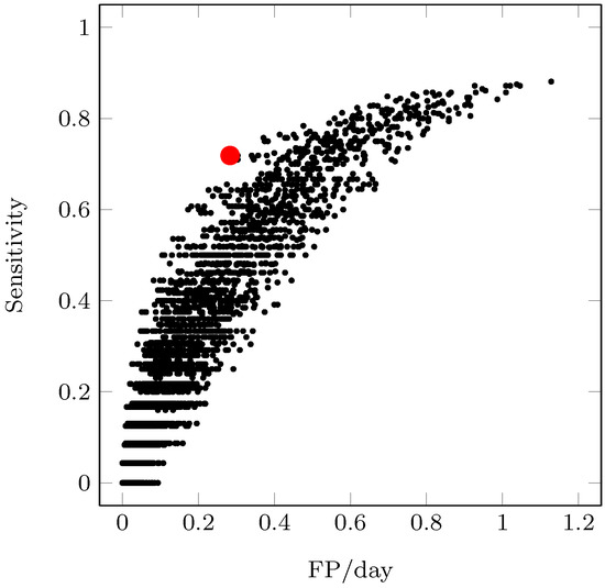 A parameter set consisting of the (1) long time window length; (2) short time window length; (3) GFM threshold; (4) IFM threshold; and (5) glucose slope threshold was determined via the pROC curve. The parameter set with metrics closest to the upper left corner was chosen for future analysis. Figure 4 displays the pROC curve, and Table 2 lists the parameter ranges investigated and the chosen parameter values. The “⋯” in Table 2 indicate a continuation of the previous step size until the end value is reached. All combinations of the parameters listed in Table 2 were investigated and plotted in Figure 4. With the chosen values, the algorithm was able to achieve a 71.8% sensitivity with 0.28 false positives per day. It is important to note that the LISA detection algorithm sent alerts at fairly high glucose levels (Table 1), indicating that the LISA detection algorithm will not completely prevent hyperglycemia following an infusion set failure. However, since these failures were detected earlier by the algorithm than by the patients, LISA-induced hyperglycemia will likely be mitigated if the LISA detection algorithm were implemented in real-time.