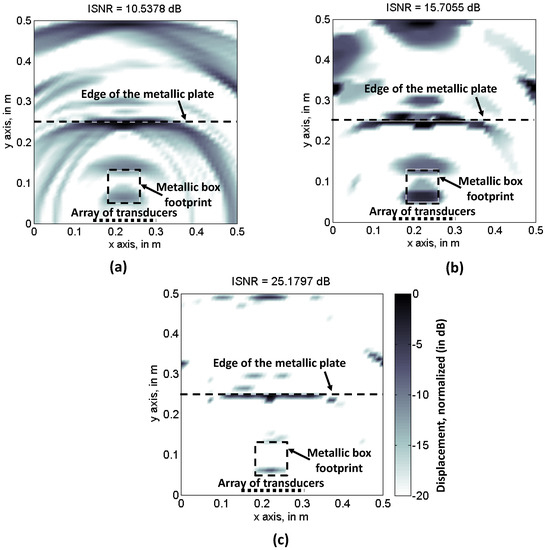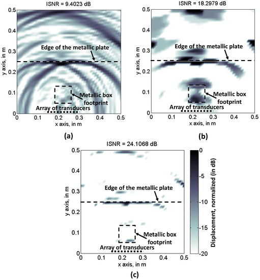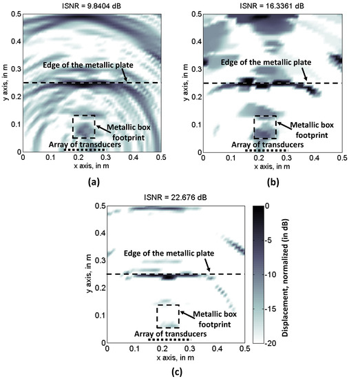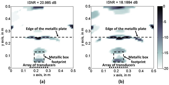 First, backpropagation imaging and CS algorithms are applied using the entire set of acoustic pressure samples (N = 756). Results for backpropagation imaging are depicted in Figure 3a. Note that the footprint of the metallic box, as well as the reflection occurring in the far edge of the metallic base plate. As Fourier imaging cannot be applied to filter out non-desired contributions, a degradation of the image sharpness, with respect to the imaging results presented in [6], can be noticed, especially in the areas close to the left and right sides of the plate. Quantitative assessment of the image quality is provided by the image signal-to-noise ratio (ISNR), defined in Equation (15) of [23], which is: