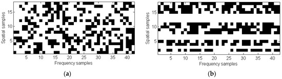 To fulfill the RIP, the sensing matrix is generally a binary random matrix [12,13,14,15,16,17,18,19,20,21,22,23,24,25,26,27]. In this situation, Nsub out of N positions arranged in a Nx × Nf matrix are selected. For example, Figure 4a represents a random sensing matrix that fulfills Nsub = 0.6Nx × 0.6Nf = 0.36N. Note that although only 36% of the samples are selected, there is at least one selected spatial sample for each frequency, and vice-versa.