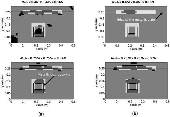 Evaluation of Compressed Sensing images quality. Pixelized CS-TV image and mask representing the metallic box footprint and the opposite edge of the metallic plate. (a) Results using Figure 4a sampling scheme (random sampling); (b) Results using Figure 4b sampling scheme (partial random sampling).