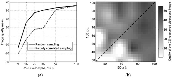 (a) Comparison of the CS-TV image quality defined by Equation (12) for the two sampling schemes; (b) Image quality analysis (0-white meaning bad performance, and 1-black meaning good performance) of the CS image quality for different number of frequency and spatial samples (partial random sampling). Dashed line denotes the same number of frequency and spatial samples.