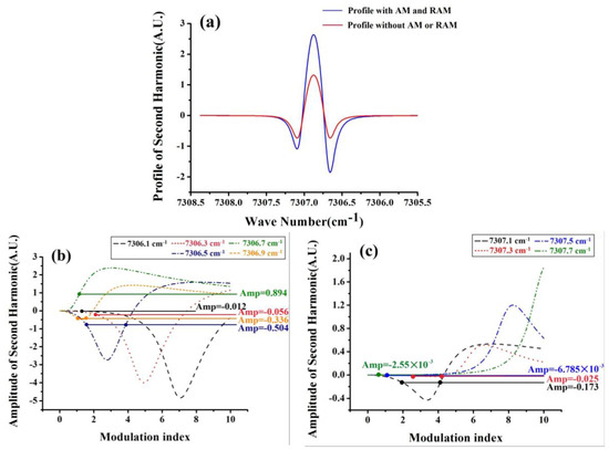 Amplitude of the second harmonic with amplitude modulation (AM) and residual amplitude modulation (RAM) is greater than that without AM or RAM in (a), so we can learn that the profile with AM and RAM can be adjusted to the profile without AM or RAM. Relationships between the amplitude of the second harmonic and the modulation index m are given in (b,c) by solid lines, so we can learn that not only can the profile be adjusted, the value of the modulation index for the adjustment can be obtained.