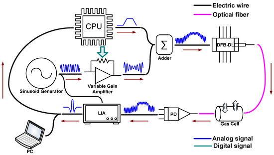 TDLS with wavelength modulation spectroscopy (WMS) enables alternating-current (AC) detection at some frequency of choice and the use of a lock-in amplifier (LIA) for better signal recovery [17,18,19,20]. Each harmonic signal is proportional to the concentration of target gas and can be measured with the LIA. An important advantage of this technique is that detection is shifted to higher frequencies. As a result, the laser excess noise (1/f noise) becomes negligible. Furthermore, the use of the LIA can further reduce the noise outside the bandwidth. As a result, WMS is from one to two orders of magnitude more sensitive than direct detection. The WMS method also provides advantages in suppressing interfering background signals and providing more sensitive signal recovery when detected light is weak.