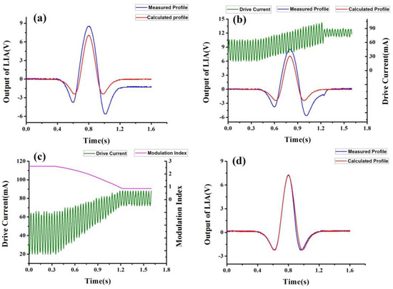 By comparing Figure 3a,d, we can find out that the close agreement between the measured and theoretical profiles validates the use of the modulation index adjustment method to recover the second harmonic signal waveform.