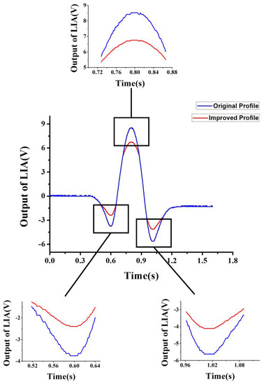 Besides, the method of modulation index adjustment can be used in many aspects which involve waveform adjustment. For instance, in practical applications with WMS detection, signal recovery is sometimes not necessary, the RAM effect can be neglected and the stability of the detection system is frequently limited by the sampling rate of analog-to-digital (AD). It is mostly caused by insufficient sampling at the peak of the profile, especially when the scanning ramp frequency is relatively high. With the four steps mentioned above, we can send out a waveform with softer inflection points. By adjusting the modulation index, inflection points of the profile are improved and more sampling points can land on them as shown in Figure 4. As a result, the stability of the detection system will be increased. In our experiment, when measurement concentration ranges from 5 ppm to 500 ppm, temperature is 296 ± 0.5 K, humidity is 45% ± 0.5%, pressure is 1 atm, modulation sinusoidal frequency is 8.1 kHz, sweep ramp frequency is 0.3 Hz, effective optical length is 3 m with a Herriot gas cell, resolution of the system is 0.06 ppm, and measurement stability is improved from 0.3 ppm to 0.18 ppm with waveform improvement applied. Although the amplitude of the improved profile gets smaller than that of the original profile, which results in the detection sensitivity being reduced by 20%, the measurement stability is improved by 40% because more sampling points can land on the peaks of the profile.