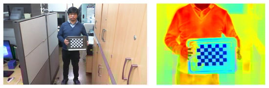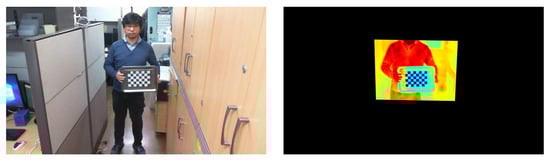 The spatial and temporal correspondence between the thermal image and the visual image are indispensable in order to leverage information from both modalities. First, the adjustment of the spatial difference is obtained by calibration and registration [,,]. The checkerboard for calibration needs to be clearly shown in both the thermal and visual images. Yet, previous works related to thermo-visual calibration need a high production cost for a checkerboard [], suffer from blurred checkerboard squares [,], and are not adoptable to conventional calibration methods []. Hence, we suggest a novel type of checkerboard which can be produced at low cost, leads to clear squares, and is compatible with conventional calibration methods. The plate material for the checkerboard is stainless steel, which has high heat conductivity. The squares of the checkerboard in both modalities are clearly presented (as shown in Figure 1) for the following two reasons. First, the large differences in heat conductivity and reflectivity between the stainless steel plate and the white-colored squares made of paper are effective, as we freeze the checkerboard before starting calibration. Second, the intensity levels of the pixels in the thermal image have been normalized for accurate calibration in order to obtain a better registration for the database. Based on the parameters computed from the calibration step, the registration between thermal and visual images is performed as shown in Figure 2. Nevertheless, registration error exists to some extent, and the spatial correspondence of the pixels between thermal and visual images is acquired by the registration step. Second, the adjustment of the temporal difference is obtained by synchronization because the restorations of the two modalities bring about a slight time difference. The video slate by hand clapping has been applied to support the synchronization of thermal and visual images.