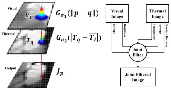The joint filtered output at position p, is computed as in Equation (1), where is the visual intensity at position p, is the thermal temperature at index position q, is the set including all index positions, is the average temperature from the initial detection region I, and N is a normalizing factor. and are Gaussian distributions that both have mean values of zero and the standard deviations of and , respectively.