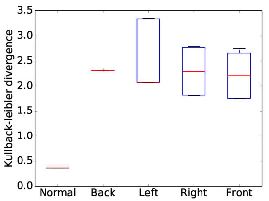 When a temperature value is close to the average temperature or the variation in temperature values is large, the response of the thermal range similarity kernel is large. Additionally, when the Kullback–Leibler divergence of a visual image, , is small, the response of the thermal range similarity kernel is large (as shown in Equation (7)). [] represents the degree of uniformity of a visual image (i.e., the amount of information). We address the issue of estimating the degree of uniformity of a visual image by calculating the similarity of a histogram distribution to a uniform distribution. We adopt the Kullback–Leibler divergence between an intensity distribution of visual image and a uniform distribution to build the measure of the degree of uniformity. A large Kullback–Leibler divergence means a small structural similarity to uniformity. A large amount of information is calculated when a visual image’s distribution resembles a uniform distribution. In order to fully exploit the large amount of information in a visual image, we allow a larger interval to the thermal range, and vice versa. To substantiate of the use of , we present Figure 4. The Kullback–Leibler divergences of the dark lighting conditions (e.g., lightings from back, left, right, and front sides) are relatively higher than that of the bright lighting condition. Eventually, the thermal range kernel is more sensitive for dark lighting conditions.
