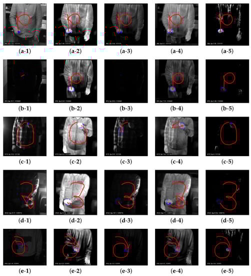 Example results of (1) V (Visual); (2) T (Thermal); (3) (multiplication-based visual–thermal fusion method); (4) (addition-based visual–thermal fusion method); and (5) (joint filter-based method) in each lighting environment: (a) normal (bright); (b) back (dark); (c) left (dark); (d) right (dark); and (e) front (dark).