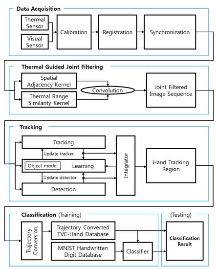 Still, most of the conventional thermal-related methods [,,,,,] are focused on face recognition. Thermal sensors have the limitation of low resolution, so the methods used face data acquired at short distances, and mostly tackle the issue of varying illumination. Based on the relative merit of radiometrically-calibrated thermal imagery, comprehensive performance analysis on face recognition shows the effectiveness of the fusion between thermal and visual sensors against the illumination issue []. Some works have also studied the performance of detecting a human body [,,], but few works have been studied the recognition of hand gestures with the guidance of a thermal sensor. Visual sensors can provide details with high resolution, though they suffer from performance degradation of hand gesture recognition caused by different lighting conditions. Thermal sensors are able to compensate the shortcoming of visual sensors against different lighting conditions, yet thermal information on its own lacks the details of a hand area and the distinction of the edge of a hand. Notably, the existing approaches deal with the two modalities as independent or with simple fusion methods. More investigation is needed to fully exploit the cooperative relation of the two modalities—thermal and visual sensors.